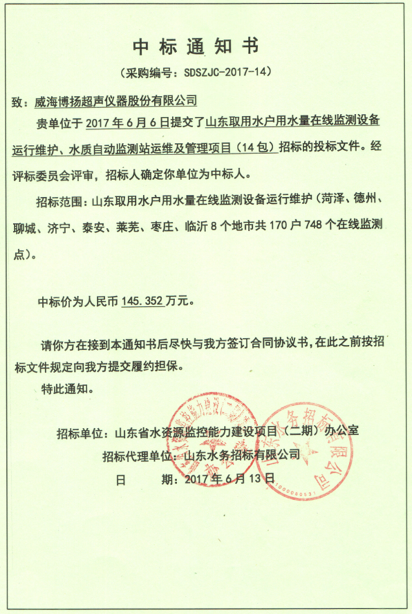 威海博揚電子科技有限公司在2017年成功中標山東省水資源監控建設項目和山東省水資源運維管理項目。出色的完成了上述項目,并獲得領導一致好評。