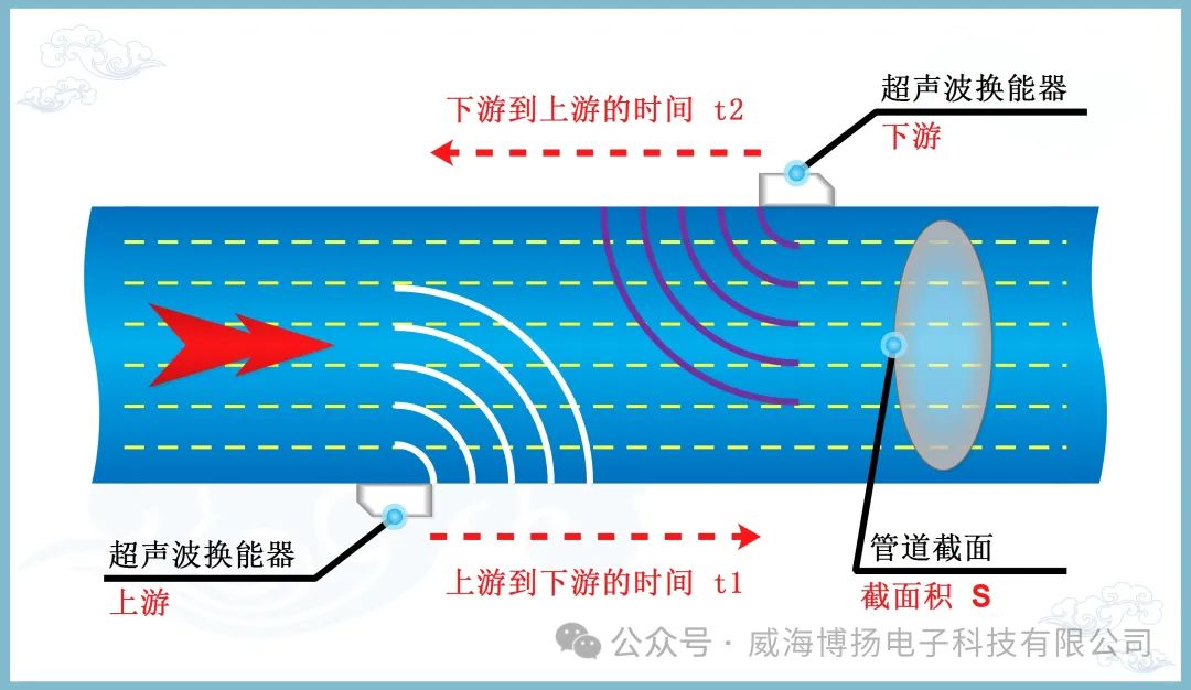 2. 傳播時間差:當流體處于靜止狀態時,超聲波傳播的時間是相同的。當流體開始流動時,由于流速的影響,超聲波的傳播路徑和時間會發生變化。通過比較上下游換能器分別發出超聲波信號的傳播時間差,我們就能計算出流體的流速。